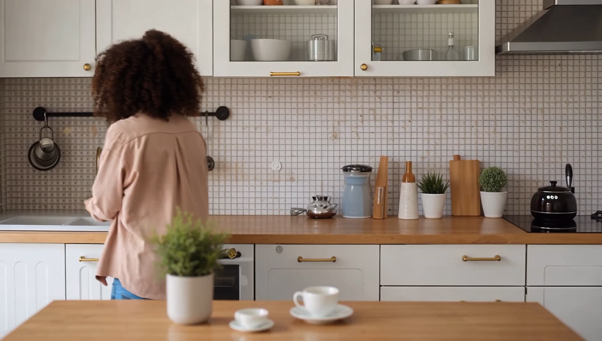 Woman sips coffee and turns around